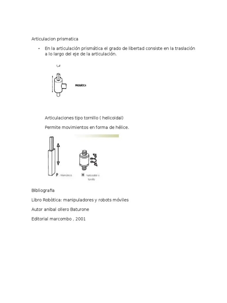 Cual es el movimiento de la articulación prismática de un robot. 1.rotacional 1 gl 2.prismática 1 gl 3.cilíndrica 2 gl 4.planar 2 gl 5.esférica (rótula) 3 gl. Cual es el movimiento de la articulación prismática de un robot. Quien me ayuda con esta tarea es para hoy y es con normas apas y no tengo portátil ni nada de eso quien me ayudas. 13/10/2017 · tipos de articulaciones • un robot convencional es una secuencia de articulaciones, formando una cadena cinemática... • la especificación de un punto del espacio se suele hacer mediante coordenadas esféricas • se adapta bien a espacios de trabajo centrados en el robot.